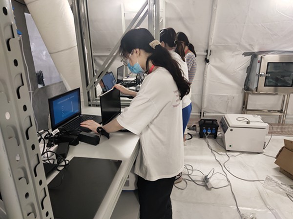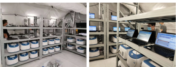 24日晚11点前,运输团队将“猎鹰号”气膜实验室所需要各类仪器、设备按时送达一线。随后技术服务团队无缝对接,连夜将仪器设备拆箱整理,两班倒通宵为3组“猎鹰号”气膜实验室做前期准备。