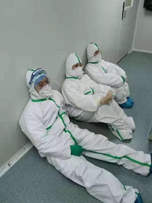 在武汉某医院安装仪器完工后,三名同事坐在医院走廊地上休息。